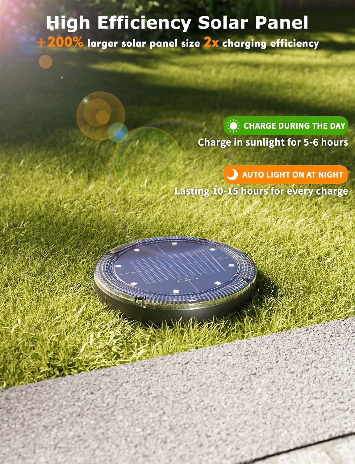 The VIODAIM Color-Changing Solar Ground Lights with 33-ft Remote Control are a modern and efficient choice for upgrading your garden walkway, driveway, patio, or lawn lighting scheme. These flat in-ground lights deliver vibrant décor and functional lighting by offering multiple fixed color options plus dynamic RGB fade and jump modes—allowing you to create lazy-Sunday ambiance, festive party lighting, or subtle pathway guidance. Designed for outdoor use, the lights are built with heavy-duty, waterproof materials rated to withstand rain, snow, or even vehicle pressure in many cases.
