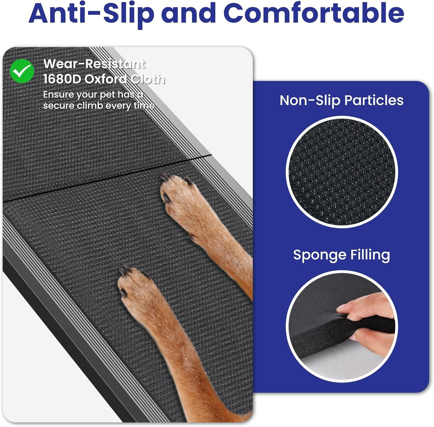 One of the key advantages of this dog ramp for car is its reinforced aluminum frame. Supporting pets up to 250 lbs, the ramp combines strength with portability. Unlike heavier ramps, it is easy to carry, set up, and store, yet remains highly durable. Aluminum also resists rust, which makes it suitable for outdoor use, including wet or sandy conditions. Pet owners can rely on it for daily use, long road trips, or vet visits, confident that the ramp will stay secure over time.