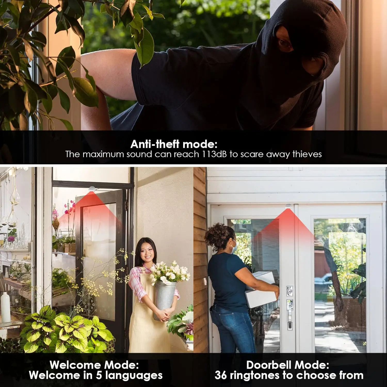 The GREENCYCLE Wireless Motion Sensor Door Chime is a versatile and reliable solution for enhancing security and communication in various settings, including homes, offices, and commercial establishments. This device offers five distinct modes—Welcome, Doorbell, Alarm, Color Light, and Lighting—allowing users to customize alerts based on their specific needs. With 36 selectable ringtones and five welcome languages, it ensures clear and personalized notifications, accommodating diverse preferences and requirements.
