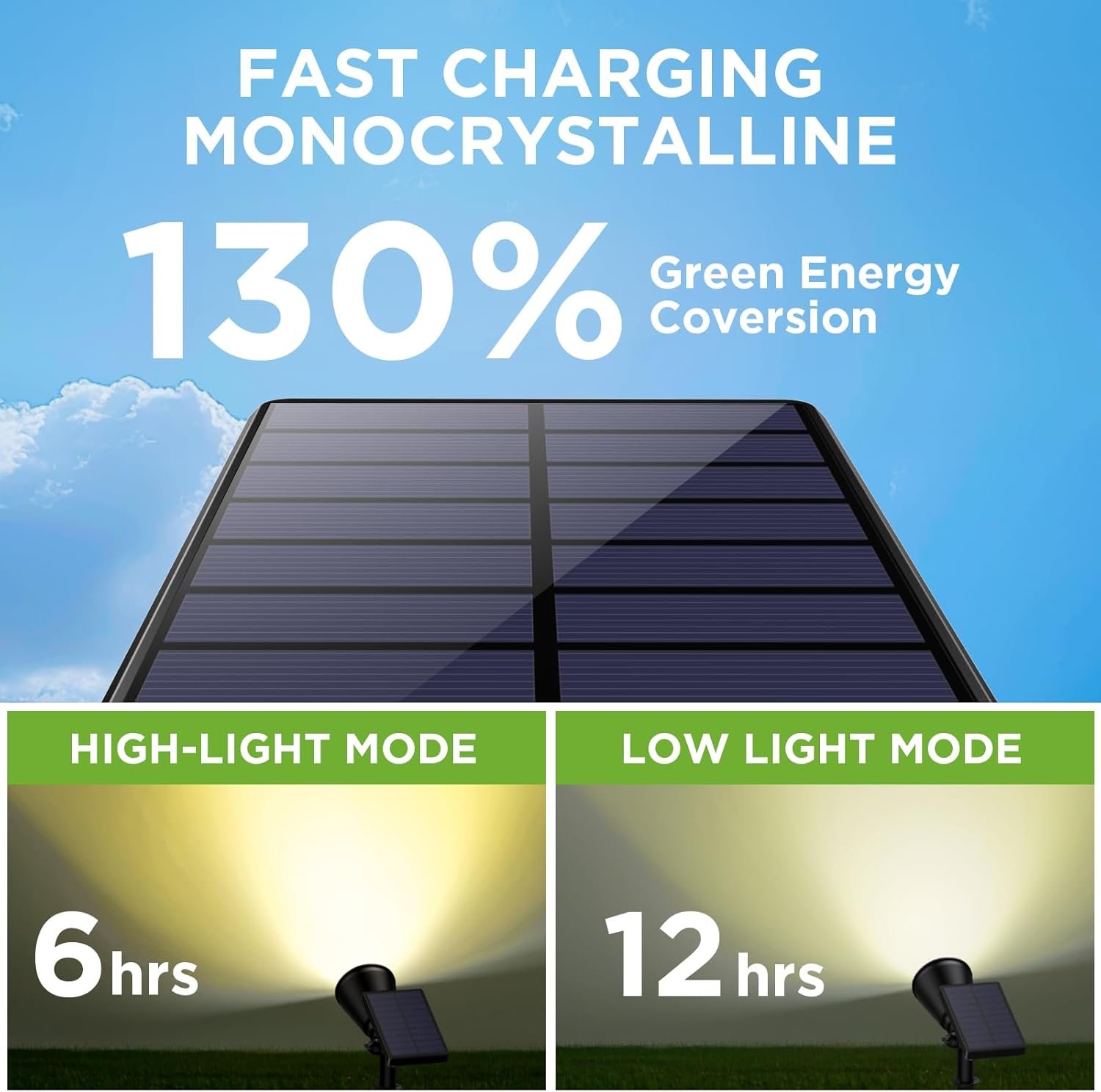 Elevate your outdoor lighting game with the InnoGear Upgraded Waterproof Landscape Spotlight — an expertly engineered, solar‑powered accent light built for performance, style, and reliability. This premium solar spotlight features an advanced monocrystalline 1.5W panel that delivers up to 30% faster solar energy conversion compared to conventional models, turning sunlight into dependable illumination even in less‑than‑ideal weather. Independently adjustable light head and solar panel angles allow you to precisely aim the beam and soak up optimal sunlight, so you can highlight driveways, garden features, walkways or flagpoles with crisp, focused lighting. This spotlight offers two working modes — a high brightness mode that delivers maximum output for up to 6 hours, and a low‑brightness mode that maximises runtime to around 12 hours after a full charge, giving you flexibility between power and endurance. Built from high‑impact ABS plastic, designed to withstand challenging outdoor environments, and certified to meet FCC, CE, RoHS and other quality and safety standards, this light is truly weather‑proof — rain, snow and wind included. Installation is effortless thanks to the dual stake‑and‑wall‑mount kit: simply insert into soil or mount on brick/wood with included screws, and you’re ready—no wiring required. With this spotlight, your outdoor space gains enhanced safety, improved curb appeal and an energy‑efficient lighting upgrade that pays dividends in aesthetics and value. Make the smart choice in outdoor illumination and experience high‑performance solar lighting at its best.