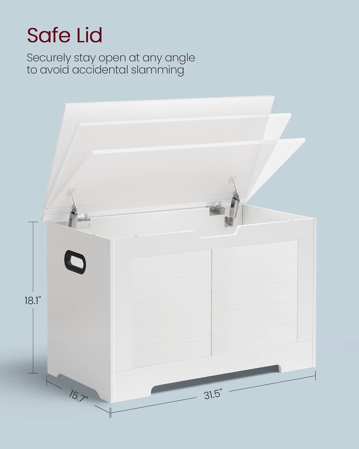 The VASAGLE Storage Chest (model ULSB063T14) is a versatile and stylish addition to any home. With dimensions of 15.7"D x 31.5"W x 18.1"H, it offers ample space to store blankets, pillows, clothes, and books, helping to keep your living area organized. The chest features two safety hinges that allow the lid to stay securely open at any angle, preventing accidental slamming and ensuring safety. Crafted from quality particleboard, it supports up to 300 lbs, making it both durable and functional. Its farmhouse style with sleek lines and handles on both sides adds a touch of elegance to your entryway, bedroom, or living room. This storage chest combines practicality with aesthetic appeal, making it a must-have for those seeking both organization and style in their home.