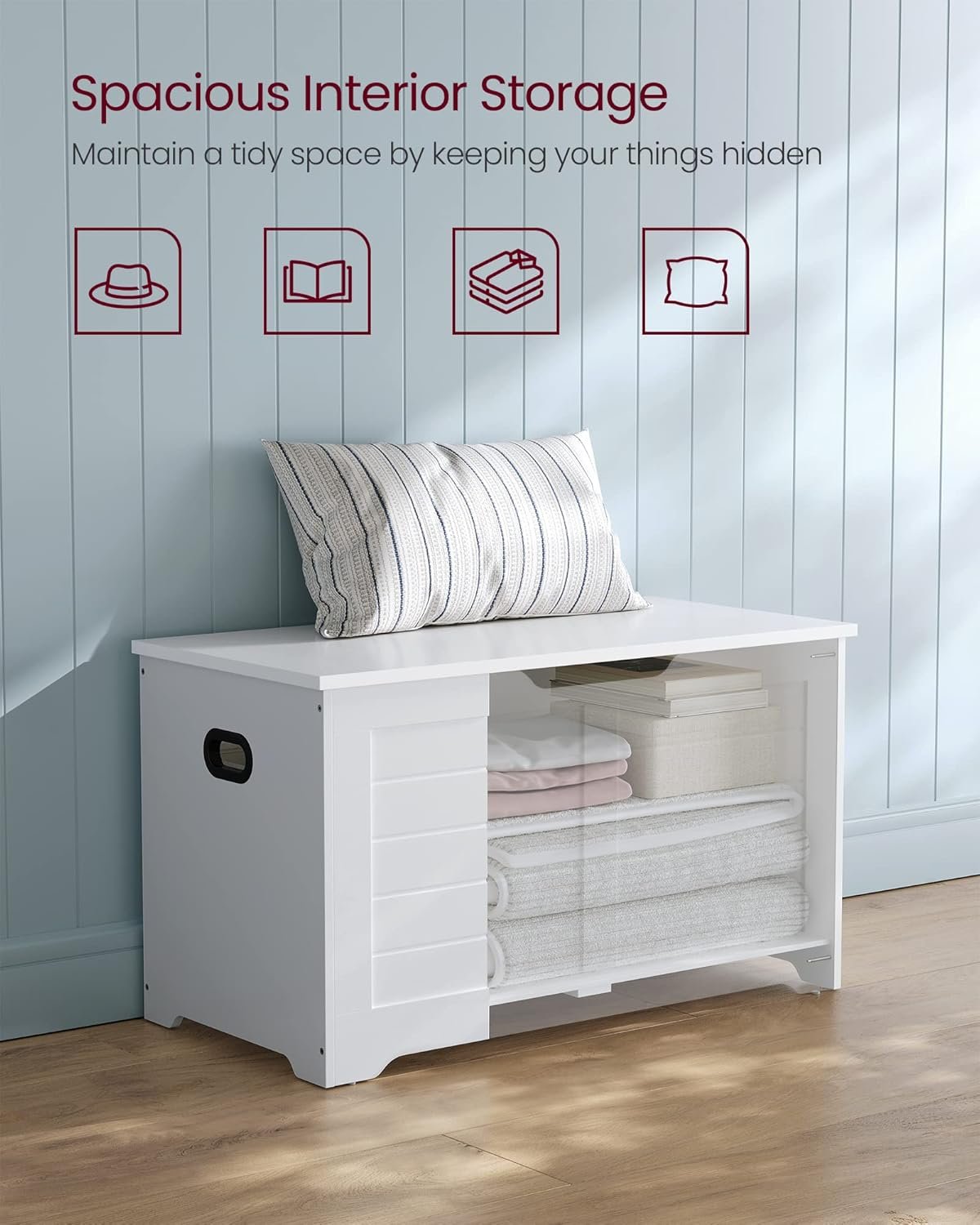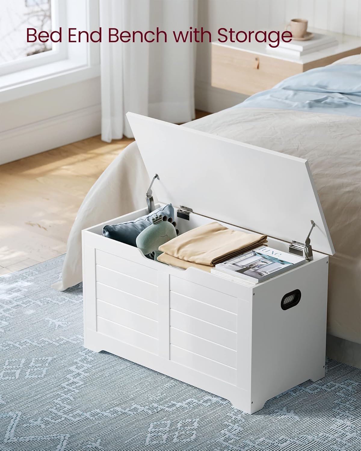 The VASAGLE Storage Chest (model ULSB063T14) is a versatile and stylish addition to any home, combining functionality with a charming farmhouse aesthetic. Crafted from durable particleboard, this storage bench offers a spacious 15.7″ x 31.5″ x 18.1″ compartment, perfect for stowing away blankets, pillows, shoes, or other household items. The top surface supports up to 300 lbs, providing a sturdy seating option for putting on shoes or as an extra perch in your living space. Equipped with two safety hinges, the lid opens smoothly and stays in place, preventing accidental slamming and ensuring safe use. Side handles facilitate easy relocation, making it convenient to move the bench as needed. Its cloud white finish complements various interior styles, from rustic to modern, enhancing the decor of your entryway, bedroom, or living room. With over 1,700 five-star reviews and an overall 4.6-star rating, customers praise its sturdiness, versatility, and ample storage capacity. Whether you’re looking to declutter your space or add a functional piece of furniture, the VASAGLE Storage Chest is a practical and stylish solution.